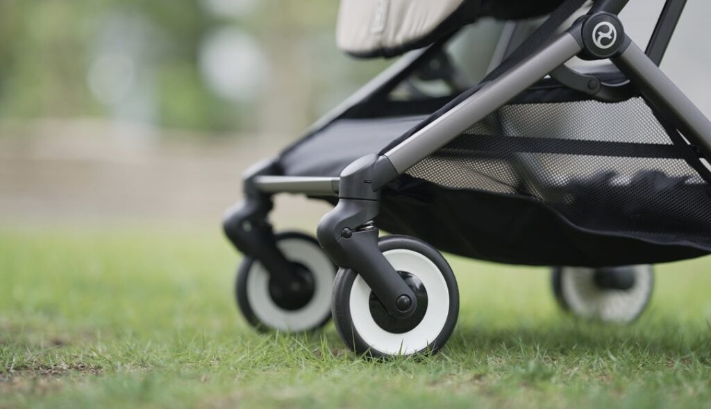 そのおかげで地面からの微振動を吸収し、赤ちゃんの快適性が上がります。タイヤの溝が追加されたことにより排水性が良くなり、雨の日も安心です!